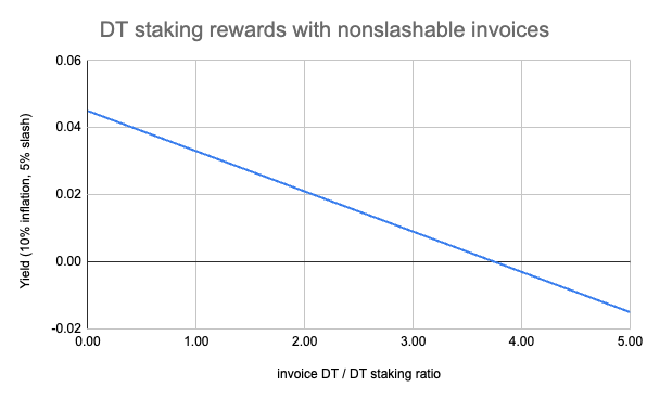 - yield of the delegators relative to the total staked invoice DTs (y axis)